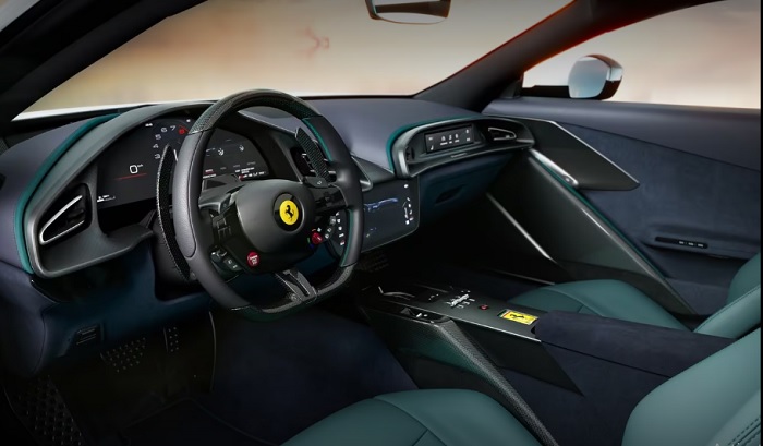 تعتمد المقصورة الداخلية تصميم “المقصورة الثنائية” (Dual Cockpit)، حيث يشعر السائق والراكب وكأنهما في خليتين منفصلتين ومتصلتين بصريًا. وتعود فيراري في هذا الطراز إلى الأزرار المادية على عجلة القيادة الجديدة. مع الاحتفاظ بزر التشغيل الأحمر الشهير الذي يطلق العنان لزئير المحرك.