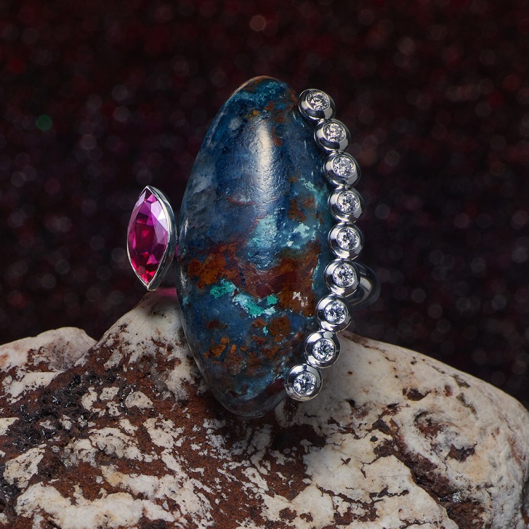 Likewise, her first collection “The Mother of Mothers” comprising only rings is no different as it too capitalizes on the strengths of rare gems such as chrysocolla azurite used in it. It’s derived from Namibia’s Tsombo deposit, recognized by the International Union of Geological Sciences as one of the richest deposits globally for its variety, rarity, and aesthetics. Buried deep beneath the region’s red soil, chrysocolla azurite is infused with an ancient and complex chemistry. Over time, the interplay of climatic conditions and mineral composition has produced a stone of unparalleled complexity in quality. Its variegated mineralization and hardness go on to necessitate a hand-carved, artisanal approach to its sculpture, resulting in truly unique and fascinating pieces. “The collection is an ode to the feminine energy and prowess as the superlative theme of creationism. Each piece is steeped in symbolism, representing the origin of life and the nurturing power of the feminine force—the mother because she is the one who nurtures and embodies the creative essence guiding all terrestrial and invisible realms,” Susana Grau Batlle said.